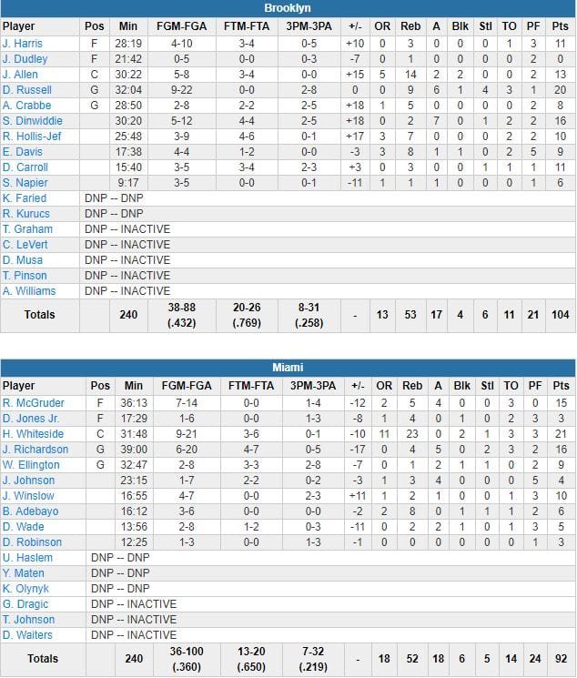 Spencer Dinwiddie a ajouté 16 points pour des Nets ayant réussi à limiter Miami à 36% aux tirs et qui se venge au passage d’une défaite infligée par le Heat au Barclays Center la semaine dernière (120-107). Les Floridiens, portés par un énorme match d’Hassan Whiteside (21 points à 9/21, 21 rebonds et 2 contres), ont raté leurs 8 premiers tirs du match avant d’ouvrir le 2ème quart sur un 14-0 (9 shoots consécutifs ratés pour Brooklyn). À la mi-temps, ils étaient devant 42-39. Les 81 points combinés par les deux équipes sur ces deux premiers quarts représente le plus petit total de deux équipes (à 33% de réussite au moment de rentrer aux vestiaires) à la pause cette saison en NBA.