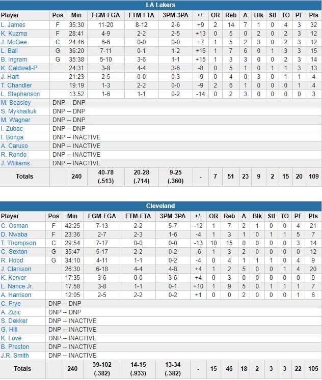 À noter : dernier Laker à être présenté au public, James a eu le droit à un « Welcome home ! » de le part du speaker Sean Peebles. Une vidéo hommage a ensuite été diffusée en son honneur à 8’09 de la fin du 1er quart-temps pendant un temps-mort. Visiblement touché, il est revenu sur le terrain en se mordant la lèvre et a remercié la salle à 360°. Les Cavs, sans George Hill (épaule) n’ont pas perdu un seul ballon en 1ère mi-temps (3 en tout, contre 15 pour les Lakers). Lonzo Ball a terminé deuxième meilleur marqueur des siens derrière James avec 15 points à 7/11, 7 rebonds, 6 passes.