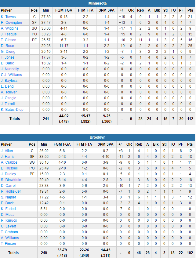 Karl-Anthony Towns (21 points à 9/18 et 9 rebonds) et Derrick Rose (25 points à 11/17, dont 2/2 à 3-pts, 2 rebonds et 3 passes en 29 minutes) sont les deux hommes du match. KAT inscrit 17 points dans le 3ème acte pour permettre aux Wolves de faire le break alors que Derrick Rose a lui marquer 11 points en dernier acte pour repousser le comeback des locaux. Taj Gibson sort un match très solide avec 16 points à 6/7, 11 rebonds et 3 interceptions, alors que Jeff Teague ajoute 15 points à 4/8.