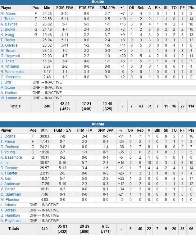 Atlanta, mené par les 19 points et 10 passes de Jeremy Lin et les 14 points (record en carrière) de DeAndre’ Bembry, a terminé à 6/35 derrière la ligne après avoir début le match sur un 1/17. Sans marquer un seul panier sur les dernières 6’19 du 2ème quart-temps, Boston a compté 16 points d’avance à la mi-temps. Tatum à 3-points, Jaylen Brown sur une claquette et Baynse sur un hook shot ont ensuite permis à l’équipe de remonter jusqu’à +29 en milieu de 3ème quart.