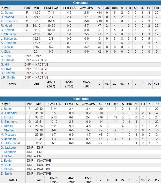 Les Sixers (dominés 42-31 au rebond et 15-4 aux points inscris sur seconde chance) auront au mieux mené 79-74 sur un layup de Simmons à 2’53 de la fin du 3ème quart-temps. Cleveland (52.7%, 11/22 à 3-points contre 53.3% et 12/33) a répondu en marquant 10 des 14 premiers points du dernier quart pour repasser devant 84-83. Puis l’écart va monter jusqu’à +15 en faveur de l’équipe de l’Ohio, sur un layup de Clarkson à 1’48.
