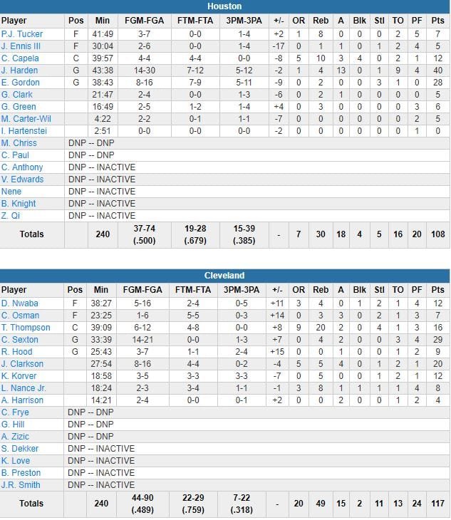 Chris Paul au repos pour ce match après une défaite en prolongation contre Detroit la veille, James Harden a joué l’intégralité de la 2ème mi-temps et terminé à 40 points à 14/30 et 13 passes en vain. Le MVP en titre a marqué 24 points en 1ère mi-temps dont 15 d’affilée dans le 1er quart. Eric Gordon l’a épaulé avec 28 points à 8/16. Cleveland a pris définitivement l’avantage en début de 2ème quart alors que les deux équipes s’étaient échangé la mène 12 fois avant cela. Sexton et Clarkson ont chacun marqué un panier pour répondre au retour de Houston, revenu à 106-102 à 5 minutes de la fin après avoir pris 10 points de retard. Rodney Hood à 3-points a donné 11 points d’avance aux locaux sur un 3-points à 2’47 de la fin.