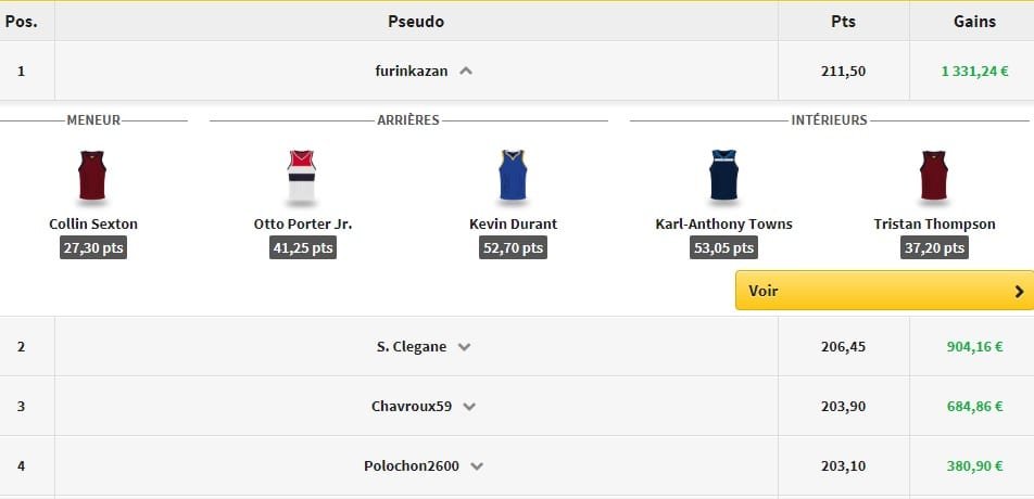 furinkazan est le grand vainqueur du jour avec le cinq suivant : Sexton, Porter, Durant, KAT et Thompson. Il totalise 211.5 points fantasy, pour 1331€ de gains !