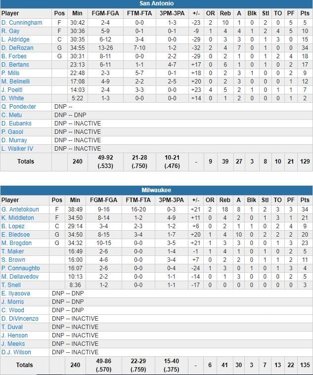 À noter : San Antonio avait effacé un déficit de 15 points en moins de 5 minutes plutôt dans le match. Milwaukee a démarré son match en rentrant 12 de ses 13 premières tentatives. Les Spurs perdent pour la 6ème fois en 8 matchs.