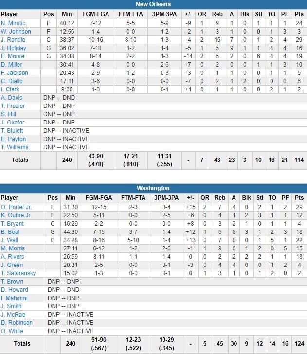 Après une 1ère mi-temps à plus de 60% de réussite pour les deux équipes, Washington a tenu New Orleans à 35.4% (17/48) en seconde mi-temps et s’est imposé de 10 points, porté par les 29 points d’Otto Porter Jr. (record en saison) et les 22 points et 8 passes de John Wall. Austin Rivers a lui marqué 12 de ses 18 points dans le dernier quart pour les Wizards, 56.7% de réussite sur le match (record en saison). L’avantage a changé de camp 14 fois avant un 15-5 décisif des locaux pour se détacher. Anthony Davis out (hanche), Julius Randle a égalé son record en saison avec 29 points (15 rebonds). Nikola Mirotic a signé 22 points et E’Twaun Moore 19 mais les Pelicans sont désormais à 2-9 à l’extérieur et 0-4 sans Davis cette saison.