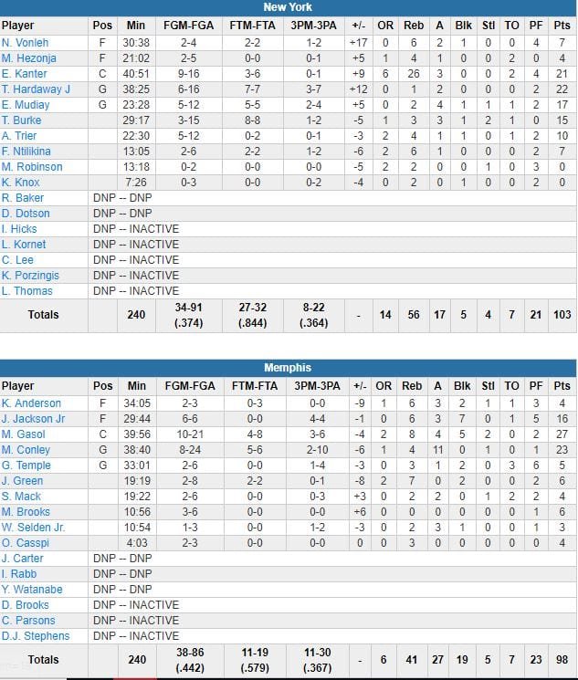 Côté Knicks Enes Kanter a battu son record de rebonds en carrière (et le record en saison) avec 26 prises (!) en plus de ses 21 points, Tim Hardaway Jr. a signé 22 points, Emmanuel Mudiay 17 et Trey Burke 15. Tous avaient à coeur de quitter le Tennessee avec une victoire pour leur coach David Fizdale, remercié par les Grizzlies en début de saison dernière.