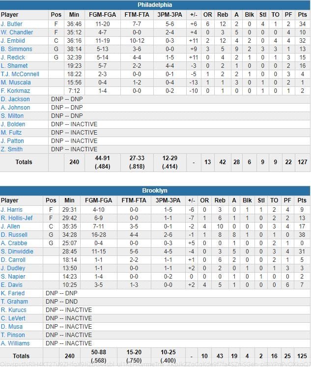 L’équipe était encore devant 118-105 sur un panier de Dinwiddie à 4’57 de la fin du match puis Philadelphie a réussi un 16-2 pour passer devant 121-120 sur un 3-points de J.J. Redick (15 points à 5/14) à 1’03. Le premier avantage du match depuis les deux premiers points du match marqués par Joel Embiid (32 points à 11/19, 12 rebonds, 4 passes) pour les Sixers. Joe Harris a calmé l’hémorragie locale avec un 3-points mais Embiid a trouvé un 2+1 sur une faute de Harris pour redonner l’avantage aux siens, 124-123. Dinwiddie a ensuite brièvement refait passer les Nets devant avec un shoot sur Redick. Sur une remise en jeu à 10.2 secondes de la fin, Butler est ensuite resté bien patient avant d’armer ce qui deviendra le game winner.