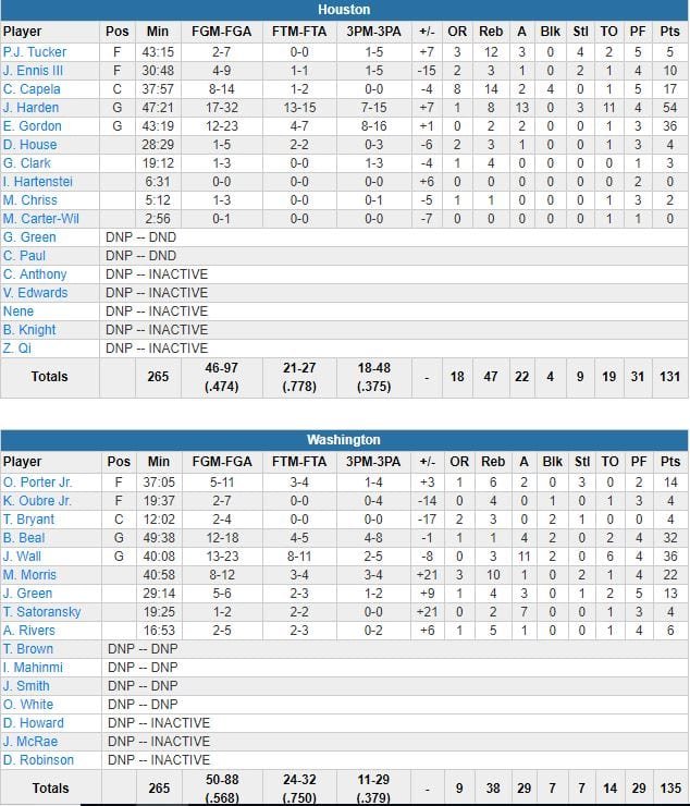 Bradley Beal n’était pas en reste avec 32 points (record en saison) à 12/18 et Jeff Green a sorti 22 points à 8/12 et 10 rebonds en sortie de banc. Otto Porter Jr. a rentré un runner à 4’37 pour le premier panier de la prolongation et Washington a conservé l’avantage à partir de là. Wall a suivi avec un jump shot pour le +4 (129-125) avant d’en rentrer un autre pour le +5. À 1’50, Beal a permis aux siens de se détacher 133-126 sur un dunk. Harden, 44 points sur les 3 premiers quarts-temps, a raté 5 de ses 7 tirs dans le 4ème quart-temps. En prolongation, il a shooté à 1/2 et rentré 2 lancers-francs. Il a aussi commis 3 de ses 11 ballons perdus durant les 5 minutes supplémentaires.