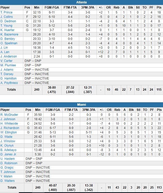 Les Hawks étaient toujours devant de 13 points à 8’50 de la fin après un 3ème quart serré (34-32 Miami) puis les locaux sont repassés devant grâce à un 14-0 (7 points de Richardson). Atlanta a répondu avec un 7-0, puis Miami a récidivé, 5-0 et plus qu’un point d’écart. Prince a porté le score à 115-113 en faveur des Hawks avec un 1/2 sur la ligne et après un temps-mort d’Erik Spoelstra, Dwyane Wade (18 points à 6/11, 3 passes) a servi Richardson qui était contrairement à lui, libre.