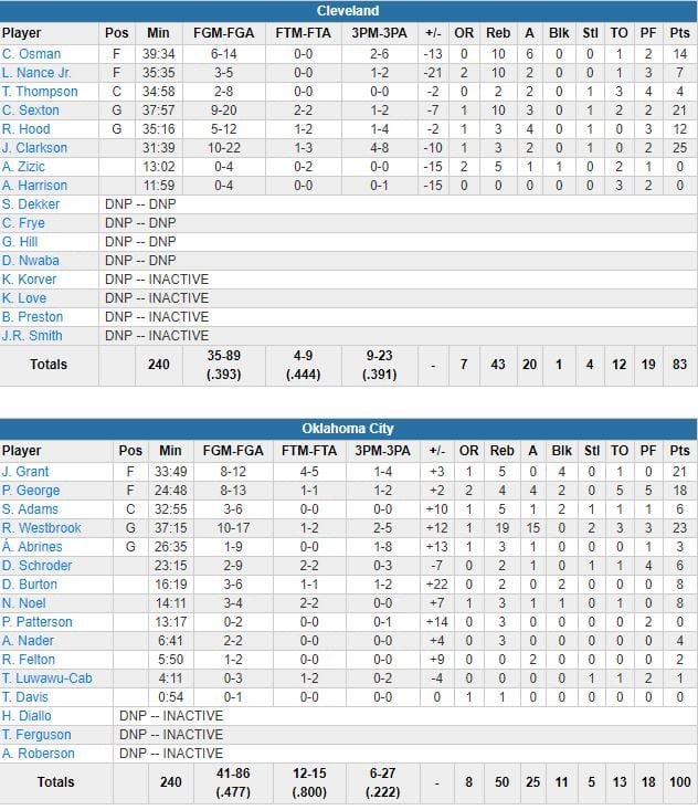 Jordan Clarkson a terminé meilleur marqueur des visiteurs avec 25 points (10/22), Collin Sexton a terminé à 21 points à 9/20 et 10 rebonds et Osman 14 points à 6/14, 10 rebonds et 6 passes. Alex Abrines était titulaire pour la première fois de la saison pour OKC mais a terminé à 1/9.