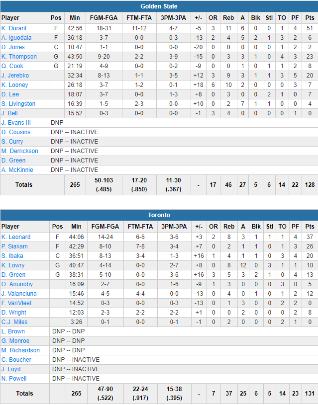 Le duel entre les deux superstars Kawhi Leoanrd a tenu également ses promesses puisque Durant compile 51 points à 18/31 dont 4/7 à 3-pts, 11 rebonds et 6 passes, soit son 3ème match de suite à au moins 40 points (1ère dans sa carrière), tandis que Leonard signe lui 37 points à 14/24 dont 3/6 à 3-pts, 8 rebonds et 3 passes. Les Raptors terminent avec 52.2% aux tirs dont 15/38 à 3-pts avec 26 points de Pascal Siakam, 20 de Serge Ibaka, tandis que Kyle Lowry compile 10 points à 4/14, 8 rebonds et 12 passes. Les champions sont un peu moins adroits avec 48.5% aux tirs dont 36.7% derrière l’arc. KD a été épaulé par Klay Thompson (23 points à 9/20) et Jonas Jerbko (20 points, dont 16 en dernier quart, à 8/13 et 9 rebonds).