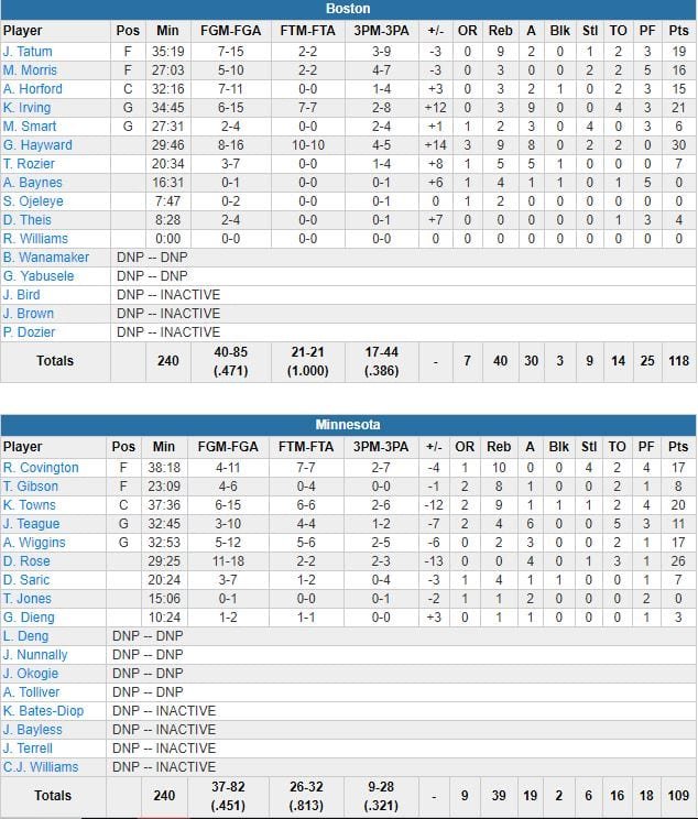 À ses côtés Kyrie Irving est venu se greffer au scoring avec 21 points à 6/15 et 9 passes, Jayson Tatum a ajouté 19 points et 9 rebonds et Marcus Morris 16 points à 4/7 à 3-points. Derrick Rose a terminé meilleur marqueur des Wolves avec 26 points (11/18, 4 passes) devant Karl-Anthony Towns (20 points, 9 rebonds) et Robert Covington (17 points, 10 rebonds). C’est la première fois en 8 matchs que Minnesota, qui restait sur 4 victoires de rang, encaisse plus de 103 points.
