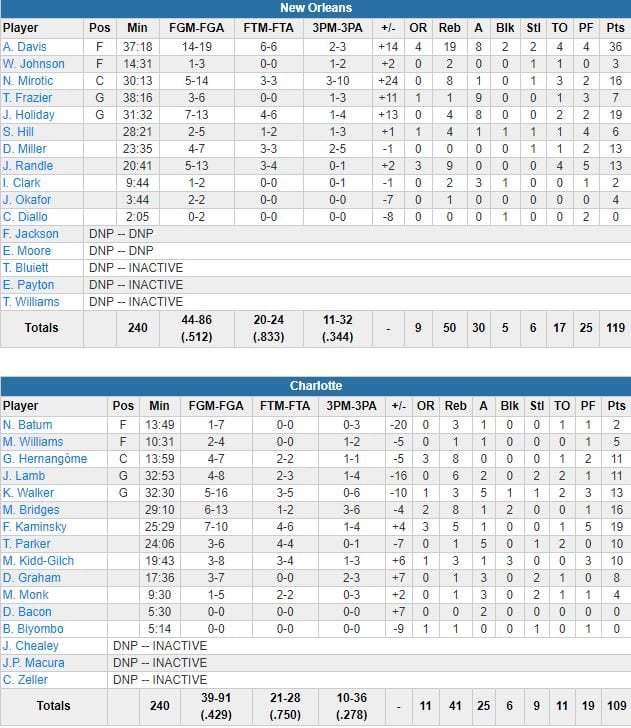 Les Pelicans ont fait la différence dans le 2ème quart-temps, remporté 36-26. En face Kemba Walker a joué 32 minutes pour 13 points à 5/16 et 5 passes. Il a rejoint le vestiaire sur une blessure à la cheville puis a fait son retour sur le parquet. Cody Zeller forfait (côtes), Frank Kaminsky a terminé à 19 points, son record en saison, mais a eu bien du mal à défendre sur Davis.