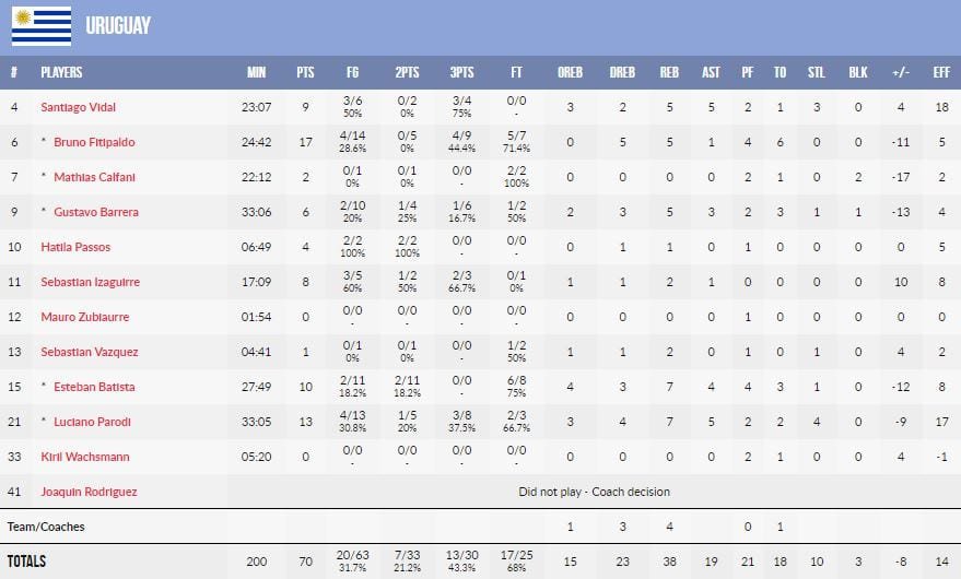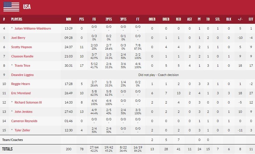 L’équipe coachée par Jeff Van Gundy (et bientôt Gregg Popovich) a été menée par les 17 points à 5/12, 5 rebonds et 4 passes de Travis Trice (1,88m, 25 ans, Wisonsin Herd, G-League) et a fait la différence avec un 22-6 sur les dernières 5’50 de la rencontre. Elle a aussi dominé 26 à 8 sur les points inscrits sur pertes de balles adverses (15 pour Team USA, 18 pour l’Uruguay). A la fin du 3ème acte cela s’annonçait mal avec une avance 54-50 pour les locaux, qui menaçaient les Américains d’une 3ème défaite dans ses éliminatoires, qui les auraient mis dans une situation délicate.