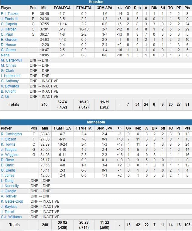 Karl-Anthony Towns a fini à 24 points à 10/24 et 11 rebonds, Andrew Wiggins 16 points à 6/11, 4 rebonds et 3 contres et 6 joueurs de Minnesota ont signé au moins 10 poins dans ce match. Contre seulement 3 pour Houston, dont James Harden (29 points à 8/17, 4 rebonds, 8 passes) et Clint Capela (24 points à 11/14, 8 rebonds, 3 passes, 3 contres). Les Rockets ont pris jusqu’à 19 points d’avance en 1ère mi-temps avant de voir Minnesota prendre un avantage définitif dans le 3ème quart. Houston a été limité à 38.1% et 2/11 à 3-points dans la période, remportée 38 à 20 par les locaux.