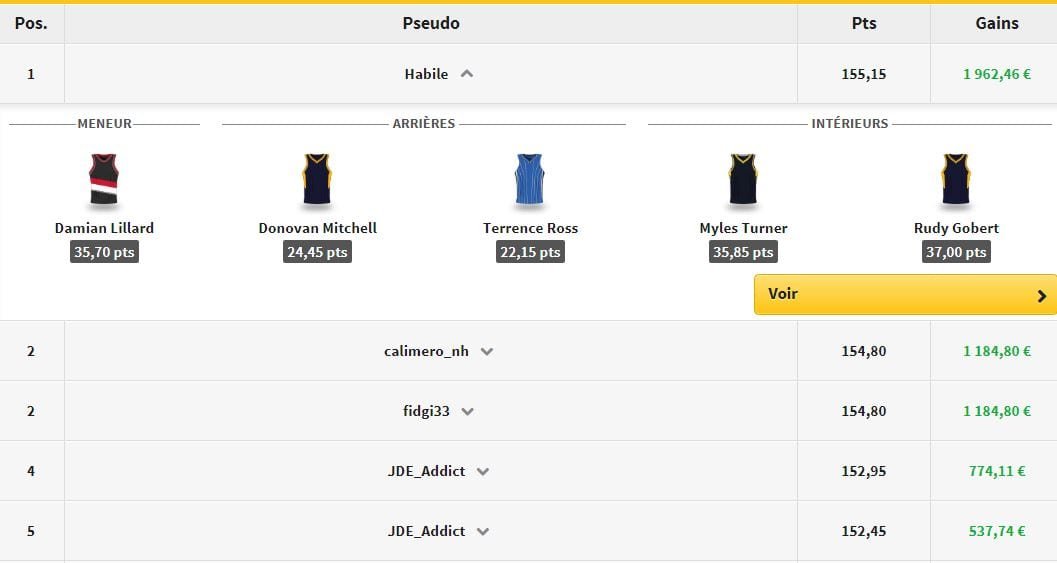 Habile est le vainqueur du jour avec le 5 suivant : Lillard, Mitchell, Ross, Turner et Gobert. Il totalise 155,15 points fantasy, pour 1962,46€ de gains !