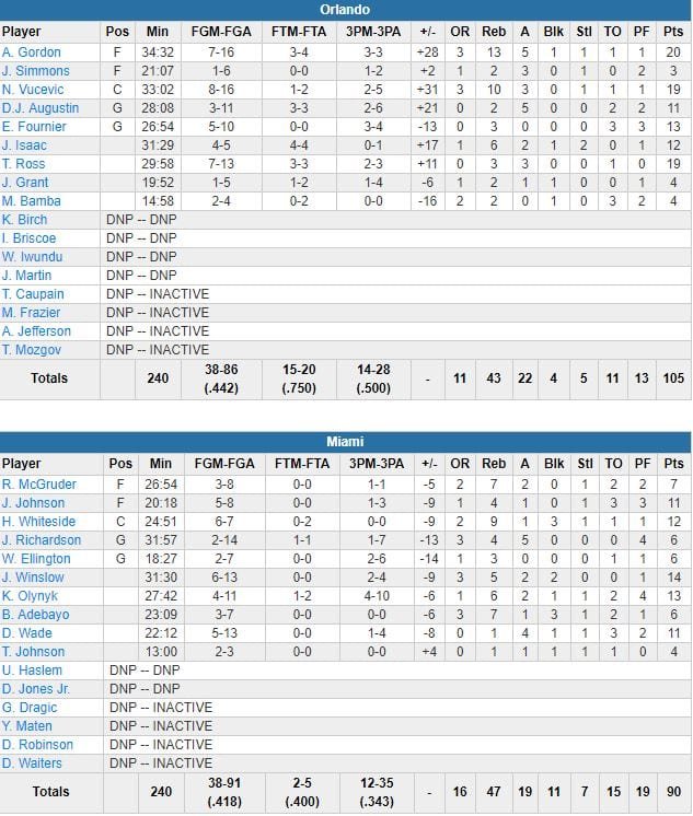 Gordon a inscrit 16 de ses points dans le 3ème quart-temps, remporté 30-12 par Orlando, qui a transformé un déficit de 4 points à la mi-temps en avantage de 14 au terme de la période. La plupart des fans de Miami (qui restait sur 2 victoires contre New Orleans et Utah) ont quitté leur siège à quelques minutes de la fin, et Hassan Whiteside (12 points à 6/7, 9 rebonds, 3 contres), benché dans le 4ème, a rejoint le vestiaire à 40.5 secondes de la fin. Indisponible en interview après le match, il aurait rejoint le terrain d’entraînement pour bosser ses lancers-francs (4/28 sur les 6 derniers matchs). Sur le match, Miami, limité à 24% dans le 3ème quart-temps (aucun ballon perdu par Orlando dans la période) a terminé à 2/5 sur la ligne, contre 15/20 pour le Magic.