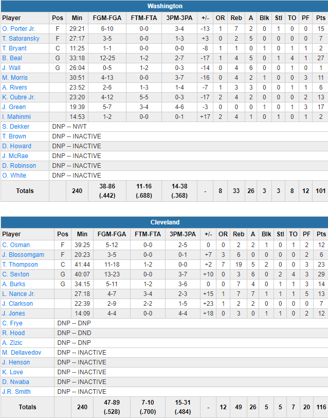 Les Cavaliers dominent les Wizards 116-101 avec un super Collin Sexton (29 points à 13/23 et 6 passes), parfaitement épaulé par Tristan Thompson (23 points à 11/18, 19 rebonds et 5 passes) et Alec Burks (14 points à 5/11 et 7 rebonds). Les Cavaliers livrent une excellente prestation offensive avec 52.8% aux shoots dont un superbe 15/31 à 3-pts alors que les Wizards rentrent seulement 44.2% de leurs tirs dont un 14/38 à 3-pts. Si Bradley Beal a été à la hauteur avec 27 points à 12/25, John Wall, de retour, signe 1 point à 0/5 et 6 passes en 26 minutes !