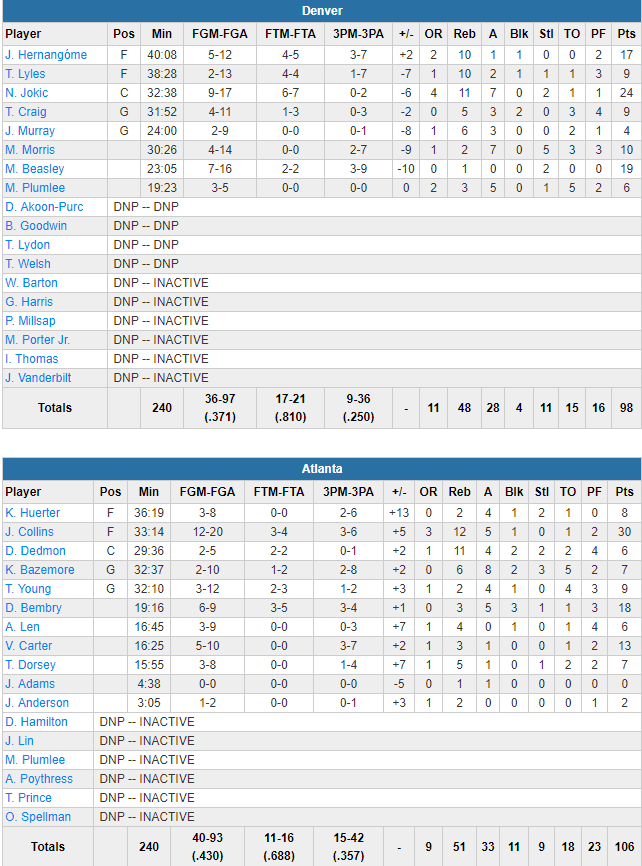 Face à des Nuggets décimés, les Hawks l’emportent 106-98 à la faveur d’un 3ème acte remporté 35-21 et dans le sillage d’un énorme John Collins, qui compile 30 points à 12/20, 12 rebonds et 5 passes. DeAndre’ Bembry et Vince Carter sont également précieux avec 18 et 13 points. Denver connait une sale soirée avec tous ses absents et shoote à seulement 37.1%. Les 24 points à 9/17, 11 rebonds et 7 passes de Nikola Jokic ne suffisent pas.