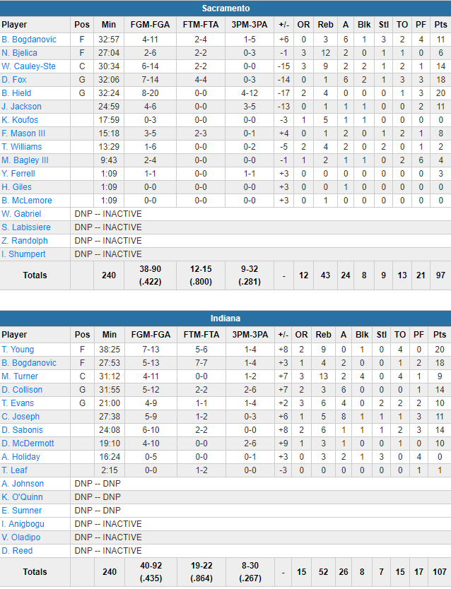 Fin de série pour les Kings, qui restaient sur 3 succès mais s’inclinent à Indiana face aux Pacers, qui enchaînent eux une 3ème victoire. Les pacers se sont détachés dans le dernier quart grâce notamment à Doug McDermott. les locaux ont fait parler leur collectif avec 7 joueurs à au moins 10 points dont 20 pour Thaddeus Young, 18 pour Bojan Bogdanovic et 14 pour Domantas Sabonis et Darren Collison. En face les 20 points de Buddy Hield et les 18 de De’Aaron Fox n’ont pas suffi, la faute à des dernières minutes difficiles.