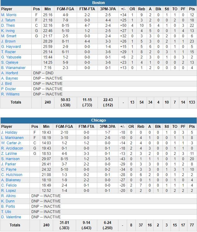 Ça va définitivement beaucoup mieux pour les Celtics, vainqueurs, attention les yeux, 133-77 dans l’Illinois cette nuit. Jaylen Brown a terminé meilleur marqueur des siens avec 23 points (8/11, 5 rebonds, 3 passes) en sortie de banc, Daniel Theis a égalé son record en carrière avec 22 points (8/15), 10 rebonds, 5 passes et 4 contres et un plus/minus surréaliste de +50.