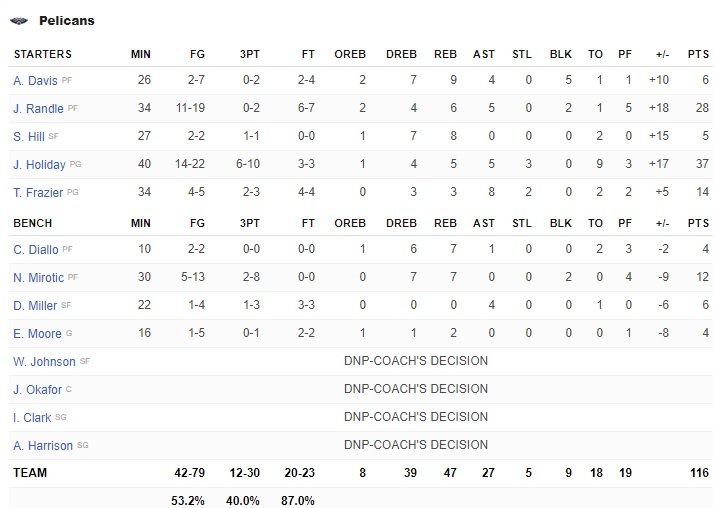 Touché à la hanche, Anthony Davis n’a pas eu son impact habituel, limité à 5 points à 2/7, 8 rebonds, 4 passes et 5 contres en 26 minutes. Mais NO a pu compter sur un énorme duo Jrue Holiday (37 points à 14/22 dont 6/10 à 3-pts, 5 rebonds et 5 passes) – Julius Randle (28 points à 11/19, 6 rebonds et 5 passes). Tim Frazier (14 points à 4/5 et 8 passes) et Nikola Mirotic (12 points à 5/13 et 7 rebonds) ont été aussi précieux et ont contribué à la belle adresse des Pelicans, qui ont rentré 53.2% de leurs tirs dont un 12/30 à 3-pts. En face les Pistons ont été bien moins en réussite avec 43.3% dont un 9/29 à 3-pts et un très moche 13/24 sur la ligne des lancers. Le trio Blake Griffin (35 points à 13/25 dont 4/9 à 3-pts et 5 rebonds ), Andre Drummond (23 points à 10/23, 19 rebonds, dont 11 offensifs) et Langston Galloway (24 points à 9/20 dont 4/10 à 3-pts) a été bien seul, et la défense pas au niveau pour espérer mieux. Reggie Jackson a été totalement dominé par Holiday, limité à 2 points à 1/6.