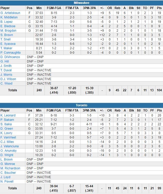 Les Raptors sont revenus à 97-94 sur un 3-points de Leonard à 2’07 mais Brogdon a égalisé à 1’07 avant de donner l’avantage aux siens là encore à 3-points et à 40 secondes du buzzer. Khris Middleton (10 points à 3/9, 9 rebonds), 5 passes sur le match, est celui qui a servi Brogdon sur ses deux paniers primés décisifs. Fred VanVleet (record en saison avec 19 points) a répondu avec un layup mais Antetokounmpo a restauré l’avance de 3 points des Bucks avec un dunk. Leonard a ensuite manqué un 3-points pour l’égalisation, Ersan Ilyasova a récupéré le rebond et tué le match aux lancers-francs à 7 secondes.