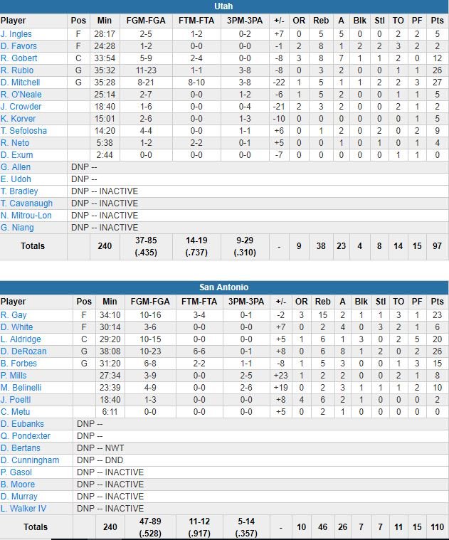 La défense a repris le dessus dans ce match avec un Jazz tenu à 18 points dans le 1er comme dans le 2ème quart (season-low aux points encaissés en 1ère mi-temps pour les Texans). Donovan Mitchell, 27 points (8/21, 5 rebonds), n’a pas marqué le moindre point sur ces 2 premiers quarts (0/6). Deux premiers quarts bouclés sur un avantage 54-36 (Utah à 36%) pour San Antonio. Utah est revenu à 10 points (82-72) avant de jouer le dernier quart grâce à un 36-28 dans le 3ème mais les Spurs n’ont pas laissé le match leur échapper dans les 12 dernières minutes, dominées 28 à 25.