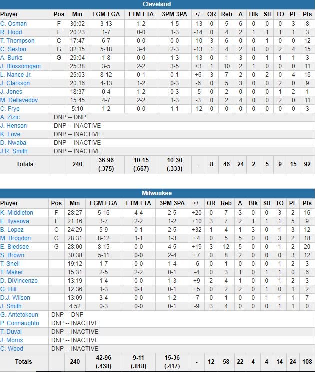 Devant de jusqu’à 18 points à la mi-temps puis 26 dans le 3ème, l’équipe (11/21 à 3-points sur les 2 premiers quarts, 4/5 pour Bledsoe) aurait eu tort de forcer la présence de sa star. Les Cavaliers sont au mieux revenus à 13 points à 5’40 de la fin et face aux remplaçants. Budenholzer a tout de même refait rentrer ses titulaires jusqu’à ce que Milwaukee soit définitivement à l’abri.