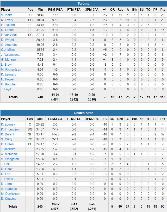 Sans Leonard, les Canadiens ont pu compter sur un super 5 majeur, mené par Kyle Lowry (23 points à 9/18) et Serge Ibaka (20 points à 7/16 et 12 rebonds), bien aidés par Danny Green (15 points à 6/11) et Pascal Siakam (13 points à 5/10). Ils shootent à 48.4% dont 9/28 à 3-pts et ne perdent que 11 ballons. A noter que Jonas Valanciunas s’est cassé le pouce. En face les Warriors n’y étaient pas, limités à un terrible 6/26 à 3-pts et avec pas moins de 19 ballons perdus. Stephen Curry a vécu une sale soirée avec 10 points à 3/12 et Klay Thompson (14 points à 7/17) n’a pas été bien meilleur, et au final Kevin Durant a été un peu seul avec 30 points à 13/22.