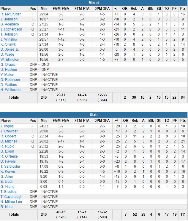 Rentré bredouille (ou…) d’un petit road trip à San Antonio et Oklahoma City, le Jazz a rebondi à la maison cette nuit avec une victoire de 27 points (111-84) sur Miami. Donovan Mitchell a signé 21 points à 9/17, 5 rebonds, 3 passes, Derrick Favors 17 points à 7/8 et 8 rebonds en sortie de banc, Kyle Korver 16 points à 4/5 à 3-points et Rudy Gobert 10 points à 4/7, 11 rebonds, 2 passes et 2 contres en 25 minutes.