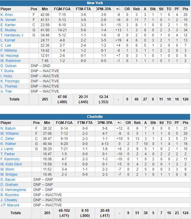 À noter : Kevin Knox a terminé à 20 points, Noah Vonleh 15 points et 11 rebonds, Enes Kanter 15 points. Les Knicks mettent fin à une série de 5 défaites, Charlotte (dominé 35-20 dans le 4ème) restait sur 4 victoires avant ce revers.