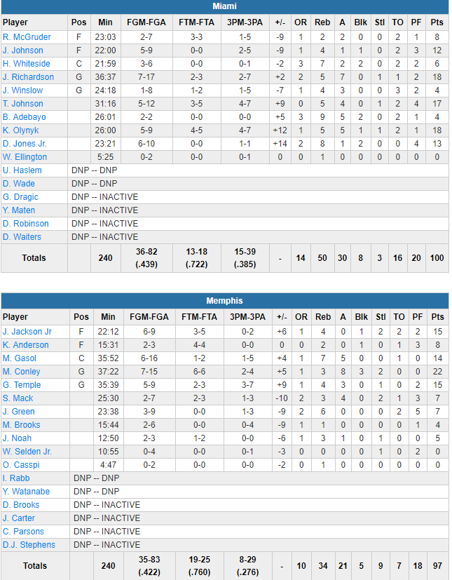 Porté par son adresse à 3-points durant un 13-2 en milieu de 4ème quart-temps, Miami, qui restait sur 2 défaites d’affilée, a battu Memphis de 3 points cette nuit au FedEx Forum. Kelly Olynyk (5/9, 5 rebonds, 5 passes) et Josh Richardson (7/17, 5 rebonds, 7 passes) ont terminé meilleurs marqueurs du Heat avec 18 points chacun. Olynyk a marqué 10 points dans le dernier quart dont deux 3-points et Derrick Jones Jr. a inscrit 9 de ses 13 points dans la dernière période. Olynyk a donné 6 points d’avance aux siens (100-94) à 7.2 secondes de la fin, puis un 3-points de Marc Gasol est venu réduire la marge à 1.5 seconde. Mike Conley a terminé à 22 points à 7/15 et 8 passes pour les Grizzlies, qui venaient de battre Portland.