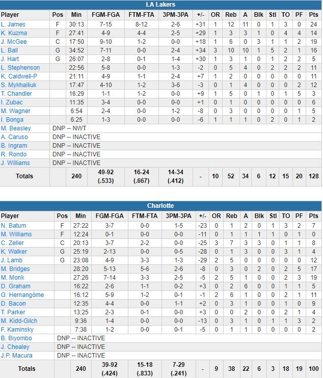 Magic Johnson et Kareem Abdul-Jabbar l’avaient fait le 22 janvier 1982. James est par ailleurs un habitué des victoires contre les Hornets. Il n’a en effet perdu qu’un seul match sur ses 28 dernières rencontres contre la franchise de Michael Jordan (27-1). Inarrêtable en pénétration, il a aidé les Lakers (devant 57-50 à la mi-temps, 7 joueurs à au moins 10 points) à faire le break 40-17 dans le 3ème quart-temps. L’équipe a pris jusqu’à 30 points d’avance dans la période (+36 au maximum sur la rencontre) et il n’a pas eu besoin de jouer le dernier quart.