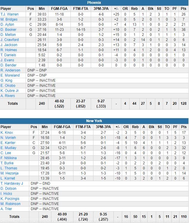 Deandre Ayton a a lui ajouté un beau double-double avec 21 points à 8/14 et 13 rebonds alors que Jamal Crawford (6 points à 3/9 en sortie de banc) a tout simplement battu son record de passes en carrière avec 14 assists. Côté Knicks (sans Tim Hardaway Jr., touché au talon), Emmanuel Mudiay a planté 32 points (12/21, 6 rebonds, 6 passes), Kevin Knox 17 points (6/16) mais l’équipe s’incline pour la 7ème fois en 8 matchs.