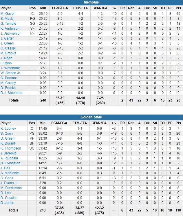 Portés par les 20 points d’Omri Casspi en sortie de banc, les Grizzlies (5ème défaite en 6 matchs) ont dominé la 2ème mi-temps 55-49 (9-0 d’entrée dans le 3ème quart) mais cela n’a pas été suffisant vis-à-vis du retard cumulé sur les 2 premiers quarts. L’équipe jouait qui plus est sans Mike Conley (ischio-jambier), Marc Gasol a lui signé 15 points à 5/9, 5 rebonds et 6 passes en 26 minutes.