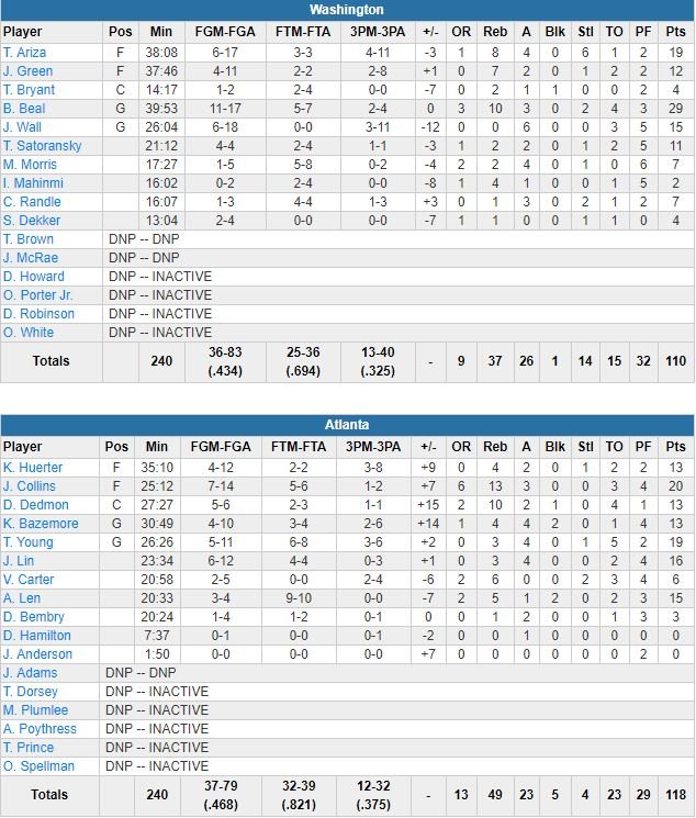 Atlanta accueillait des Wizards qui venaient de battre les Lakers la nuit dernière et contre toute attente, ce sont bien les Hawks qui se sont imposés, 118-110 ! Jeremy Lin a marqué 12 de ses 16 points dans le dernier quart et l’équipe a résisté aux 29 points (11/17, 10 rebonds) de Bradley Beal en remportant largement deux quarts-temps : le 1er (35-24) et le 4ème (36-28).