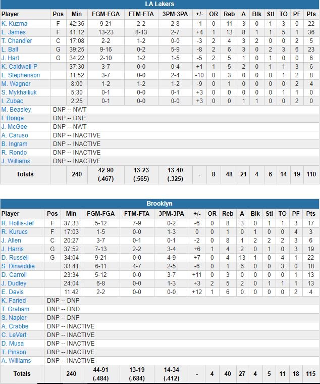 À noter : JaVale McGee (grippe) n’a pas joué. Les Lakers bouclent leur road trip avec 1 victoire pour 3 défaites. Après avoir shooté à 5/6 à 3-points dans le 1er quart, ils n’ont rentré qu’une tentative sur 10 dans le 2ème. Allen Crabbe a manqué son 3ème match consécutif (genou) pour Brooklyn.