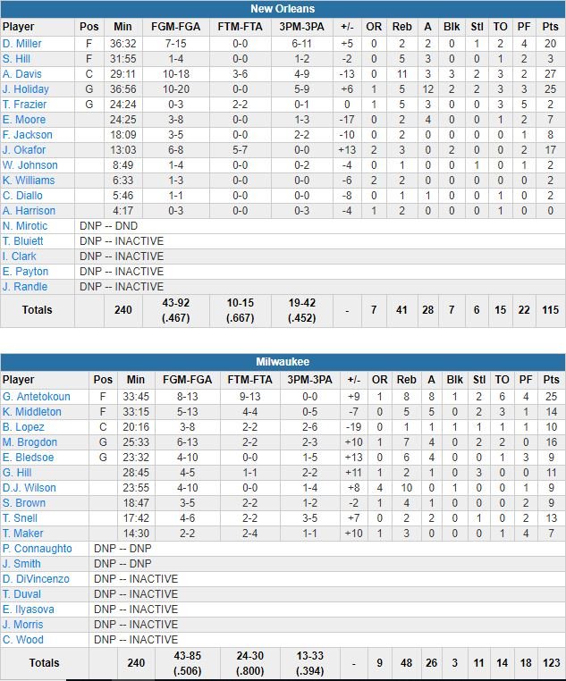 Les Bucks menaient de 12 points dans le 2ème quart avant un retour de New Orleans à 66-62 à la pause, avec un excellent passage de Darius Miller (20 points à 7/15, record en saison). George Hill a rentré un 3-points au buzzer du 3ème quart pour égalise à 90 partout dans ce match ayant totalisé 7 égalités et 14 changements d’avantage sur les 3 premières périodes. Le match est resté serré tout au long du dernier quart avant un 11-0 de Milwaukee (3ème victoire d’affilée) pour prendre 10 points d’avance à 3’18 de la fin. Les Pelicans ne se sont ensuite plus rapprochés à moins de 6 points jusqu’à la fin.