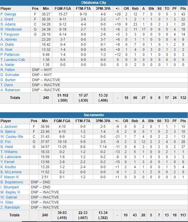 Sacramento a joué ce match sans Iman Shumpert (personnel), Marvin Bagley III (genou) et Bogdan Bogdanovic (pied). OKC était de son côté privé de Raymond Felton et Dennis Schröder, suspendus pour avoir quitté le banc contre Chicago ludi.
