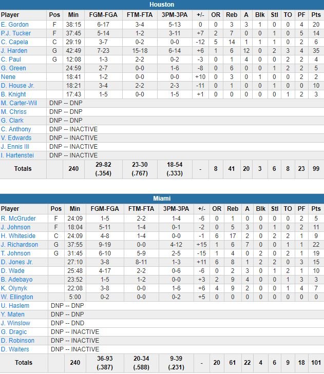 Josh Richardson a terminé à 22 points à 9/19, 6 rebonds et 7 passes, Tyler Johnson 19 points à 6/10, Hassan Whiteside 9 points à 4/8, 17 rebonds et 2 contres et Miami a dominé le rebond 61-44 ! Au lendemain de leur record NBA de 3-points, les Rockets ont cette fois shooté à 18/54 de loin, contre 9/39 pour Miami, qui s’en sort malgré un 38.7% aux shoots sur ce match (Houston a été encore plus maladroit avec 35.4%). James Harden a signé 35 points (7/23, 15/18 aux lancers-francs, 6 rebonds, 12 passes) Devant de jusqu’à 16 points, Miami a gâché une avance de 11 points dans le dernier quart avant de réussir à revenir.