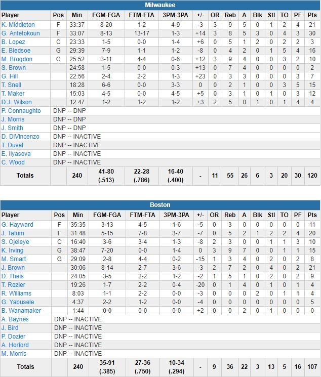 Tony Snell et Thon Maker ont ajouté 15 et 12 points alors qu’en face, Jaylen Brown a terminé meilleur marqueur des Celtics avec 21 points, devant Jayson Tatum et ses 20 unités et Kyrie Irving et ses 15 points, 9 rebonds et 7 passes. Milwaukee a dominé 55-36 au rebond et Antetokounmpo est allé 17 fois sur la ligne (13/17). Les Bucks (63% et un avantage 31-13 au rebond) dans le 1er quart ont dominé dès la 1ère mi-temps, avec un 9-0 en fin de 2ème quart-temps pour prendre jusqu’à 26 points d’avance. Boston a réussi quelques runs en profitant des ballons perdus de ses adversaires (20 à 5) mais n’est jamais descendu sous les 11 points d’écart. Milwaukee n’avait plus gagné à Boston depuis le 18 octobre 2017.