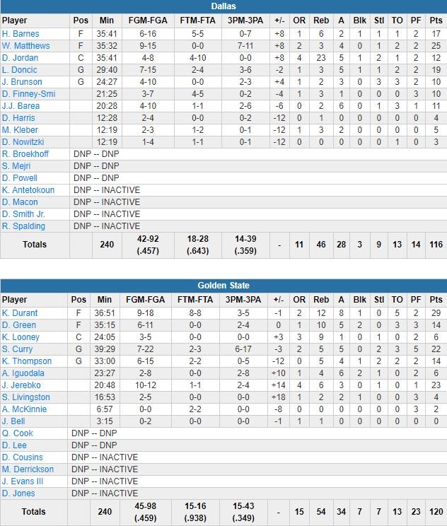 Steph Curry a terminé à 22 points (7/22), 5 rebonds et 5 passes et Jonas Jerebko a battu son record en saison avec 23 points à 10/12 et 6 rebonds en 21 minutes, Draymond Green a fini à 14 points, 10 rebonds et 5 passes. En face Luka Doncic, limité par une douleur à la hanche, a marqué 14 de ses 19 points en 1ère mi-temps, permettant à Dallas de prendre les devants 61-58 à la pause. De’Andre Jordan a lui égalé son record de rebonds en saison avec 23 et Wesley Matthews terminé à 25 points à 9/15 dans cette 5ème défaite de rang des Texans. Les champions retrouvent avec ce match la victoire après un revers à Salt Lake City.