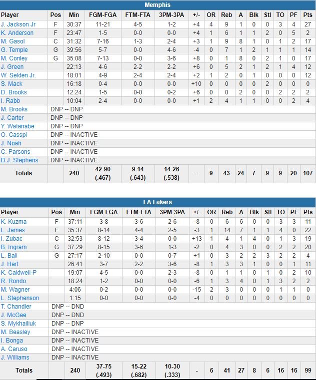 Avec leur rookie Jaren Jackson Jr. à 27 points (11/21, 9 rebonds), un Marc Gasol à 17 points (7/16), 9 rebonds et 8 passes et un Mike Conley à 17 points (7/13) et 8 passes, les Grizzlies (35-25 dans le dernier quart) ont mis fin à leur série de 5 défaites cette nuit au Staples Center en dominant les Lakers, 107-99.