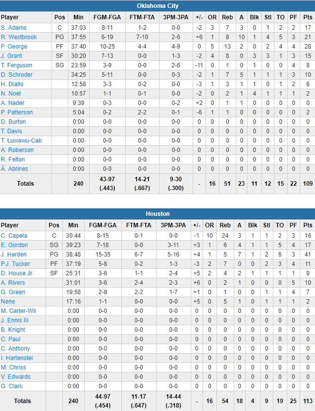 James Harden est l’homme de la rencontre avec son 7ème match de suite à au moins 30 points. Il compile 41 points à 15/35 dont 5/16 à 3-pts, 6 rebonds, 7 passes et 6 ballons perdus. Clint Capela a été solide dans la raquette avec 16 points et surtout 23 rebonds dont 10 offensifs ! Eric Gordon ajoute 17 points à 7/18 et pour son tour premier match avec Houston, Austin Rivers a été très précieux en sortie de banc. Bon en défense, il a été clutch en dernier quart et termine avec 10 points à 2/3 à 3-pts. OKC a mal géré son dernier quart et son duo Russell Westbrook (21 points à 6/20, 9 rebonds, 9 passes, 4 interceptions et 6 ballons perdus) – Paul George (28 points à 10/25 dont 4/9 à 3-pts, 14 rebonds et 3 interceptions) n’était pas dans un grand jour. Steven Adams et Jerami Grant ont fait le job avec respectivement 17 et 15 points. Le banc n’a pas été non plus à la hauteur et a permis en second et dernier actes aux Rockets de mieux démarrer.