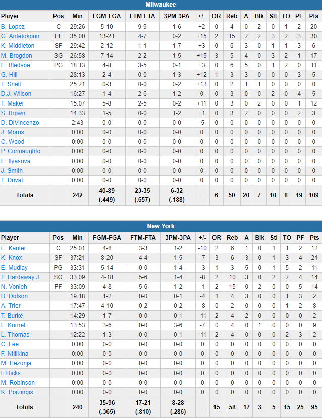 Giannis Antetokounmpo est l’homme du match avec 30 points à 13/21, 14 rebonds, 2 passes, 2 contres et 3 interceptions pour son premier match de Noël. Malcolm Brogdon (17 points à 7/14, 6 rebonds, 4 passes et 3 interceptions) et Brook Lopez (20 points à 5/10) l’ont bien épaulé. Milwaukee a connu une sale soirée à 3-points avec un terrible 6/32, mais les Knicks n’ont guère fait mieux avec 8/28. Une des clés a été leur capacité à prendre bien soin du ballon (8 ballons perdus) avec une période de près de 30 minutes sans la moindre perte de balle. Côté Knicks, qui shootent à un horrible 35.8%, Kevin Knox est le meilleur scoreur avec 21 points à 8/20 mais le seul à s’en être bien sorti c’est Noah Vonleh avec 14 points à 4/8, 15 rebonds et 2 contres. Tim Hardaway Jr. signe 14 points à 4/18. Le duo Emmanuel Mudiay – Trey Burke combine un joli 6/21, pas assez mauvais pour que Frank Ntilikina puisse entrer en jeu.