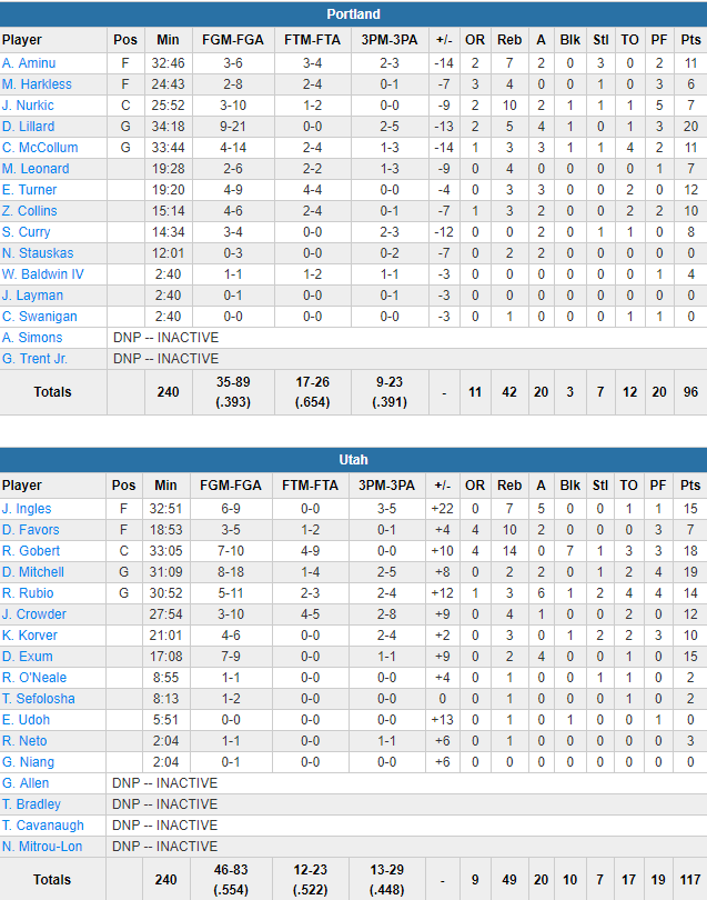 Rudy Gobert sort un grand match avec 18 points à 7/10, 14 rebonds et pas moins de 7 contres tandis que Donovan Mitchell ajoute 19 points à 8/18. Joe Ingles et Dante Exum sont précieux avec 15 points chacun alors que Jae Crowder marque 12 points à 3/10.. Le Jazz shoote à un superbe 55.4% dont 44.8% à 3-pts (13/29), tout en limitant Portland à 39.3%, pour une 5ème victoire en 6 matchs à domicile. Damian Lillard a été bien trop seul pour Portland avec 20 points à 9/21 alors que CJ McCollum marque seulement 11 points à 4/14 et Jusuf Nurkic 7 points à 3/10.