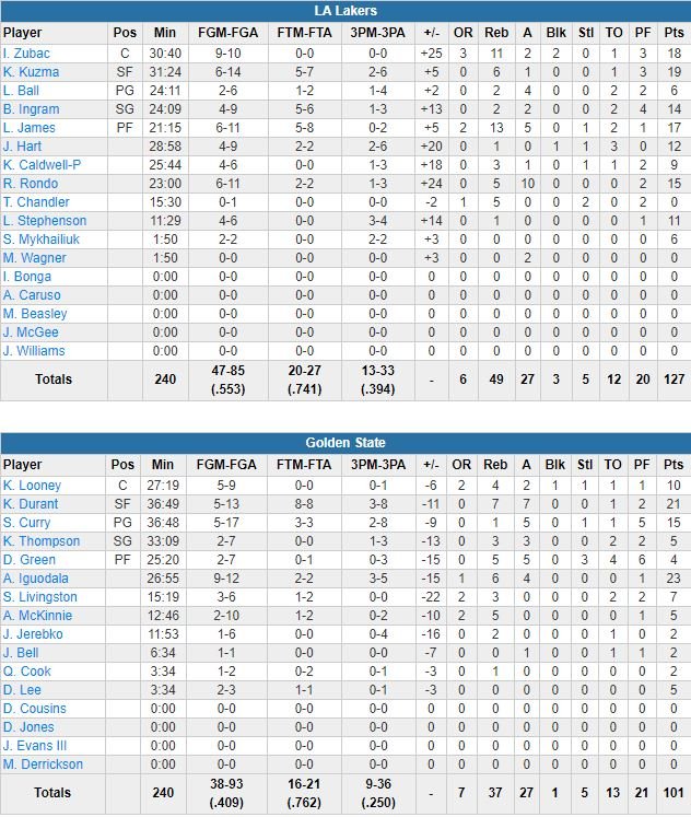Titulaire en l’absence de JaVale McGee, Ivica Zubac a rendu une très belle copie avec 18 points à 9/10, 11 rebonds, 2 passes et 2 contres et 6 autres joueurs dont James (17 points à 7/11, 13 rebonds, 5 passes en 21 minutes), Kyle Kuzma (19 points à 6/14 et 6 rebonds) et Rajon Rondo (15 points à 6/11, 5 rebonds, 10 passes) ont terminé à au moins 10 points pour L.A.