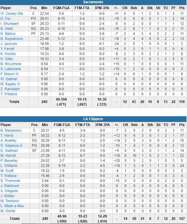 3ème victoire en 4 matchs et première depuis leur défaite à Oakland pour les Clippers, 127-118 face à des Kings qui restaient sur 2 victoires d’affilée contre Memphis et New Orleans. Sept joueurs ont signé au moins 10 points dans ce match pour L.A., dont 2 au moins 20 : Lou Williams avec 24 points à 9/15 (6 passes) et Montrezl Harrell avec 22 points à 8/12 (10 rebonds, 5 contres).