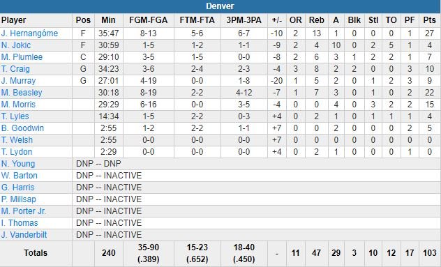 Bryn Forbes a aussi contribué au scoring avec 15 points et San Antonio se rapproche doucement de la 8ème place (9ème) avec ce 8ème succès en 10 rencontres Mené par les 27 points de Juan Hernangomez, les 22 points de Malik Beasley et les 15 points de Monte Morris, Denver (18/40 à 3-points contre 10/32 pour les Spurs) perd là un 2ème match d’affilée. Nikola Jokic a été tenu à 4 points à 1/5 en 31 minutes, Jamal Murray à 9 points à 4/19.